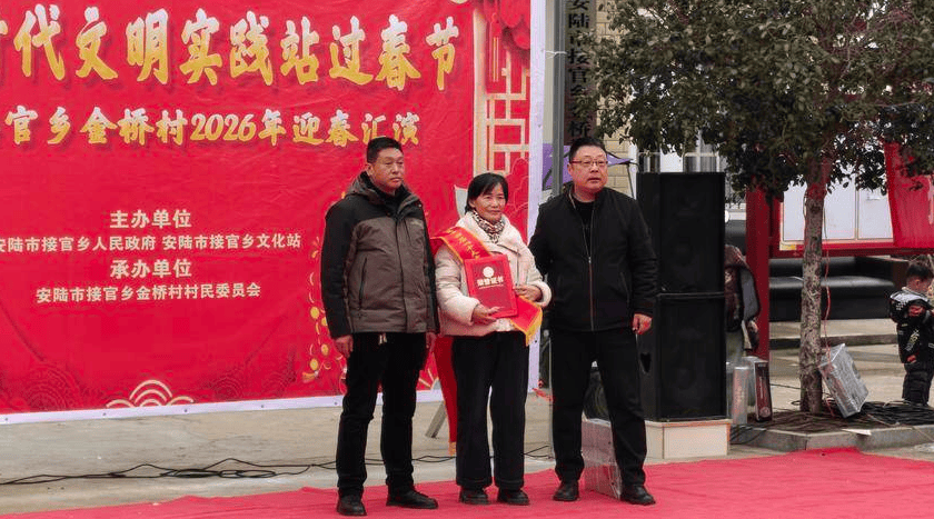 安陆市接官乡金桥村新时代文明实践站内锣鼓喧天、笑语盈盈,“龙马精神贺新岁·邻里欢聚庆丰年”春节主题活动正在这里热闹举行。文艺演出与年货集市相映成趣,近400名群众热情参与。活动在接官腰鼓队激昂的表演中拉开序幕,铿锵鼓点迅速点燃全场热情。年货集市上,本地农产品、手工制品、春联福字等摊位有序排列,村民穿梭其间,精心选购年货。活动还设置了“文明榜样”表彰环节。通过分享孝感市“十大孝子”提名奖获得者万顺容的感人事迹,以及“最美庭院”“文明小组”“优秀志愿者”等先进典型,生动传播孝亲敬老、邻里互助的文明乡风,激励更多村民见贤思齐、共建家园。