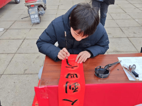 在雷公镇新时代文明实践所“迎新春 送祝福”的活动现场,墨香与欢笑声交织成一幅温暖的年节图景。书法名家挥毫泼墨,民间艺人巧手剪红,为群众送上满载祝福的“文化年货”。而在忙碌的身影中,一位少年格外引人注目——14岁的潘昌义正俯身案前,手中的毛笔在红纸上轻盈游走。“这副‘人到四方福自来’给您,爷爷,贴的时候上联贴右边!”少年将刚写好的春联小心卷好,递到一位老人手中时还不忘细心叮嘱。潘昌义不仅独立完成了二十余副春联创作,更穿梭在人群中,时而帮老人解读对联寓意,时而提醒大家注意安全。志愿者们在发放春联的同时,还积极宣传“移风易俗过新年”理念,倡导节俭环保的节日方式。许多领取春联的居民响应号召,主动加入志愿服务行列,形成了“人人为我,我为人人”的和谐氛围。